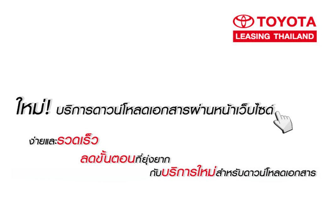 โตโยต้า ลีสซิ่ง จึงได้เพิ่มช่องทางให้บริการใหม่ขึ้น โดยท่านสามารถดาวน์โหลดเอกสารผ่านหน้าเว็บไซต์หลักของโตโยต้า ลีสซิ่ง ได้ด้วยตนเอง ด้วยขั้นตอนง่ายๆ และไม่ยุ่งยาก ท่านก็สามารถทราบข้อมูลและเตรียมเอกสารต่างๆ เพื่อนำไปใช้ประกอบการยื่นขอรับบริการอื่นๆ จากบริษัทได้สะดวก และรวดเร็วยิ่งขึ้น